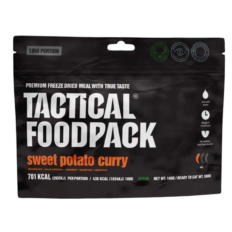 Tactical Foodpack Bataadi-kikerherne karri on taimne, vürtsikas ja toitev roog, mis ühendab endas bataadi, kikerherned, kookosjoogi ja aromaatsed maitseained. See maitseküllane retsept sobib suurepäraselt nii matkajale kui kiireks kõhutäieks kodus. Külmkuivatatud toidu kerge ja kompaktne pakend tagab pika säilivusaja ning säilitab maitse ja toiteväärtuse – ideaalne valik välitingimustesse või kriisivaruks.