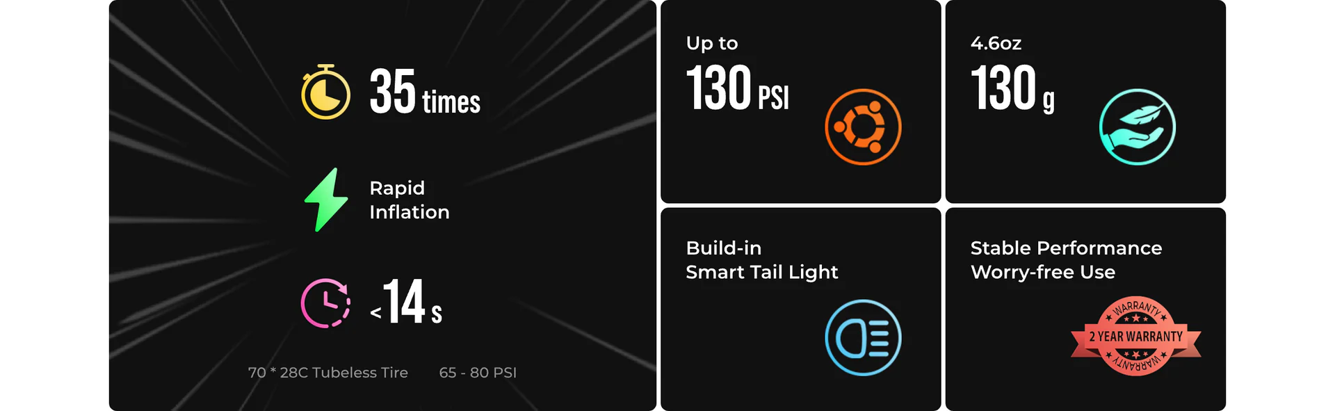 Elektriline rattapump ja jalgratta tagatuli 130PSI on loodud neile, kes soovivad ühendada praktilisuse, täpsuse ja kompaktsuse ühes seadmes. TINY TIRE PUMP 200 paistab silma oma väikese mõõdu ja kerge kaalu poolest – vaid 130 grammi –, mistõttu on seda lihtne alati kaasas kanda. Tänu nutikale disainile sobib see kasutamiseks nii linnasõitudel kui ka pikematel rattaretkedel.