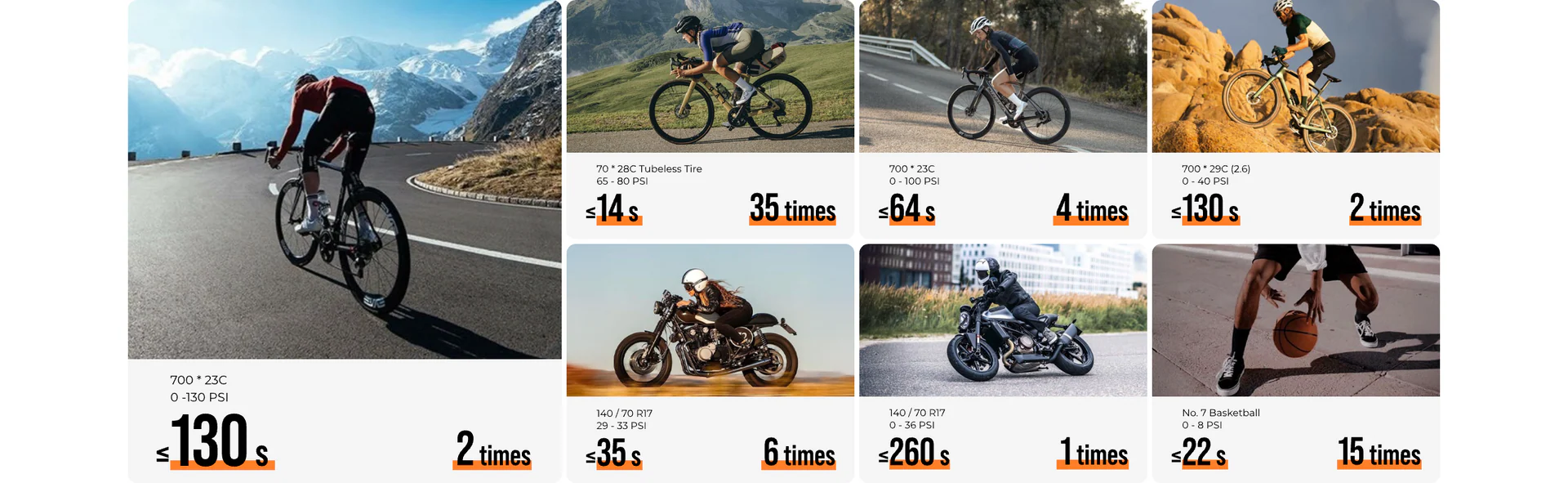 Vaatamata oma kompaktsele suurusele pakub pump muljetavaldavat jõudlust. Maksimaalne rõhk ulatub kuni 130 PSI (896 kPa), mis teeb seadme sobivaks maantee- ja mägirattarehvidele ning ka mootorratastele. Võimas harjadeta mootor pöörlemiskiirusega 11 500 p/min võimaldab saavutada 100 PSI ligikaudu 50 sekundiga, tagades kiire ja tõhusa rehvide täitmise.